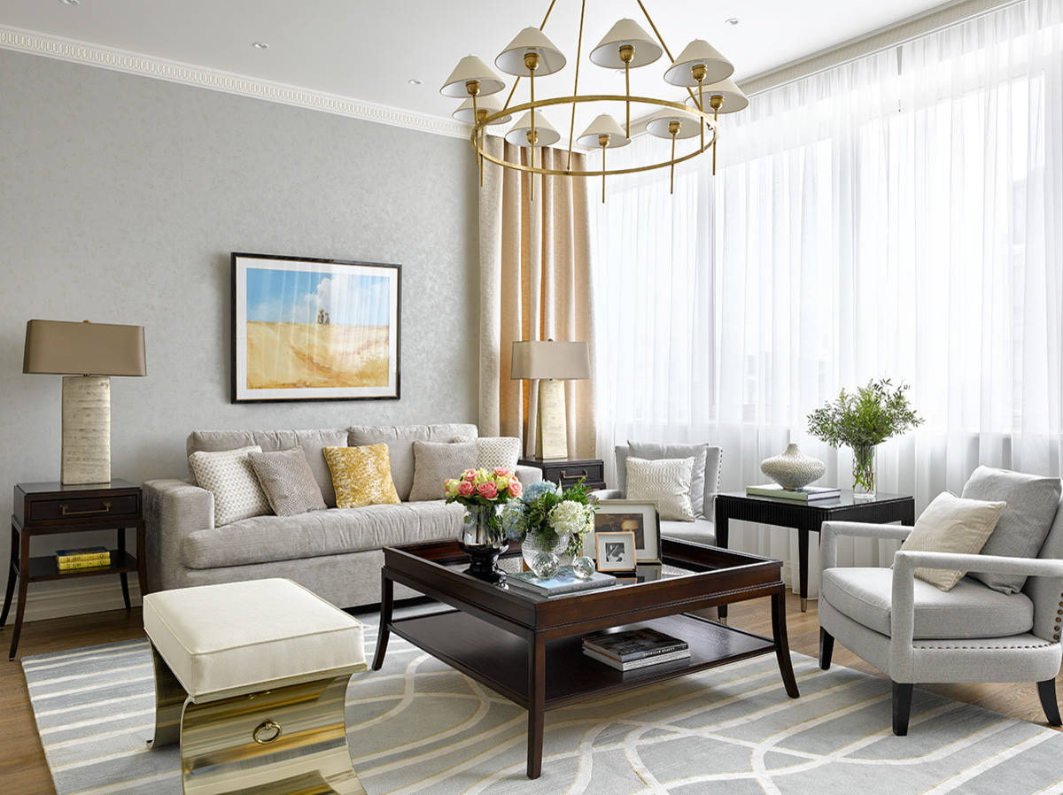 The photo shows the bright interior of the living room in the neoclassical style. The walls are decorated in cream tones and the furniture is in coffee tones.