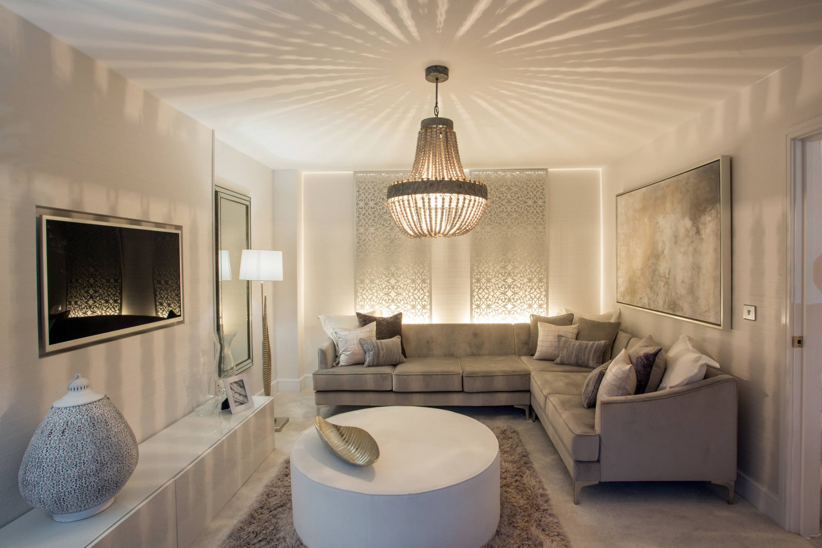 In the photo there is a living room with a luxurious theatrical chandelier, which is the main highlight of the neoclassical interior.