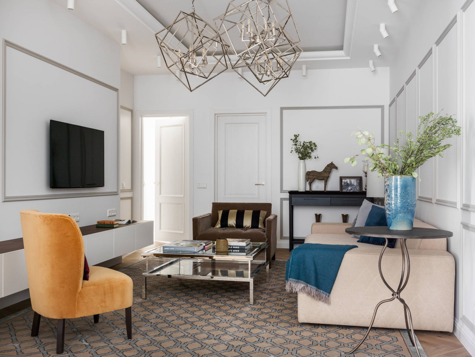 Neoclassicism does not exclude the use of white: in small living rooms, it helps to expand the space without depriving the interior of elegance. The plus of the modern style is that many canons of the classics are inappropriate here, and the color palette varies from warm to cold shades.