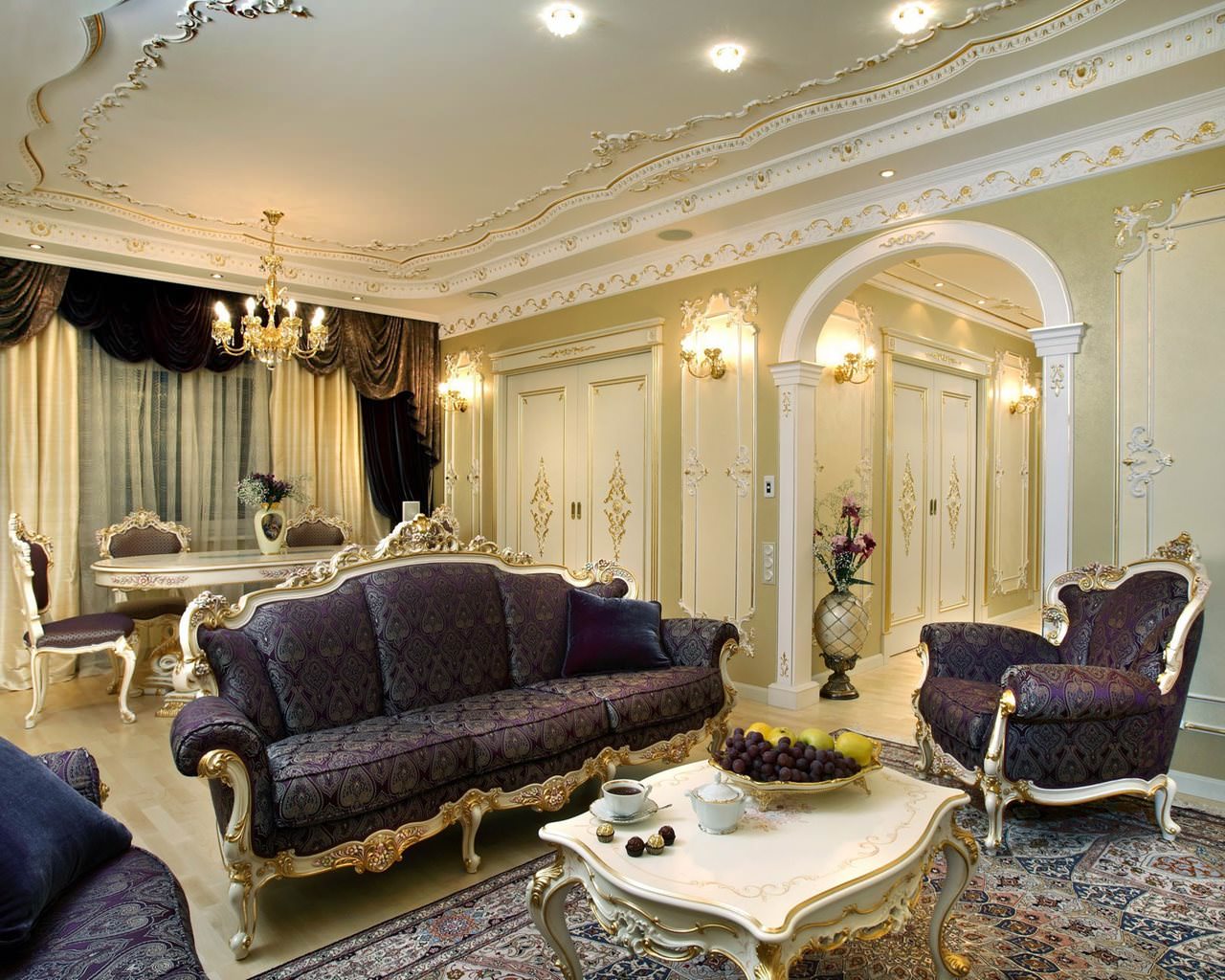 Modern baroque in the interior of the living room is distinguished by stucco molding covered with a thin layer of gold or gold paint - this is how the palaces of the nobility were decorated mainly, where the interiors served to demonstrate the wealth and high position of their owners. Today, such chic is hardly appropriate, therefore, walls and stucco moldings are painted not only in a gold tone, but also in various other colors (for example, white, gray or pink).