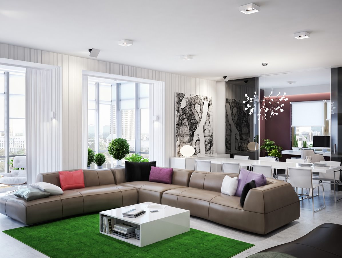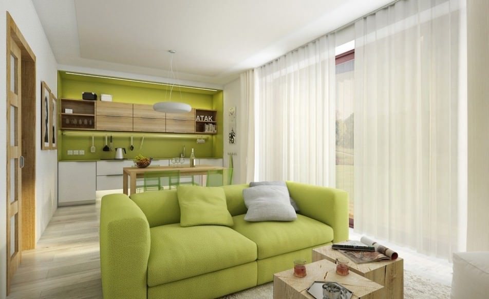 Green and red create a contrast that, when skillfully played up, can make a living room a real art object. Two such bright colors in the green interior of the living room must be softened with neutral tones, for example, white or light beige. Yellow shades are also suitable, and black accents can be accentuated.