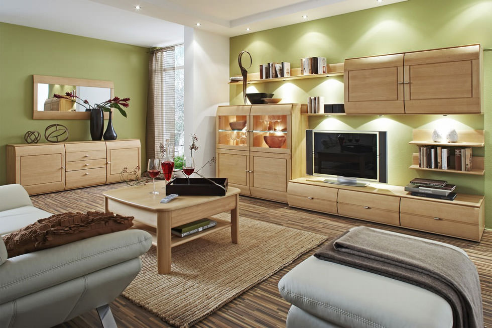 The combination of green in the living room with the color of a tree can be considered ideal - after all, this is an originally natural combination: tree trunks and foliage, earth and grass. In such an environment, a person feels natural and at ease.
