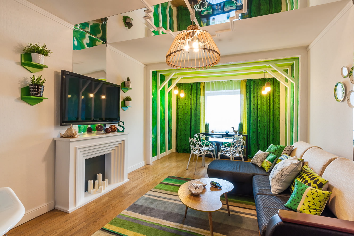 The green interior of the living room looks equally good both in the classic style and in the current modern design trends, such as eco-style, loft, hi-tech and others. The use of various shades of green in the design gives expressive and effective combinations, allowing you to fully express the individuality of the owners.