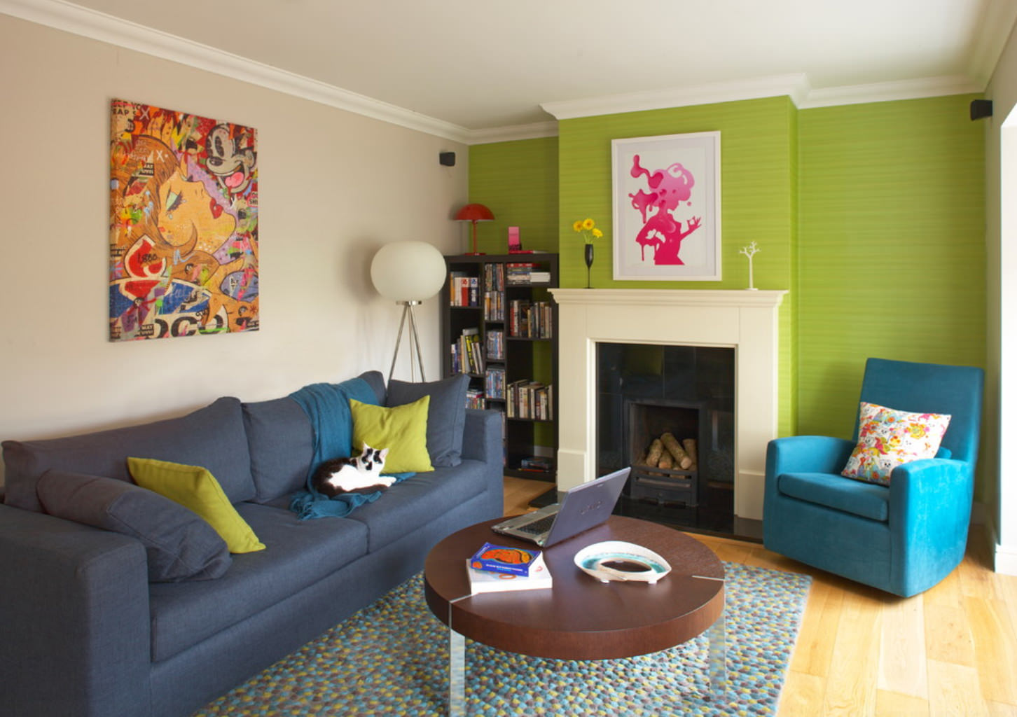 It is recommended to use blue in the living room in tones of green in combination with white or light beige. Shades of vanilla are also suitable. Dark blue looks better with pistachio, and light blue with shades of foliage and young grass.