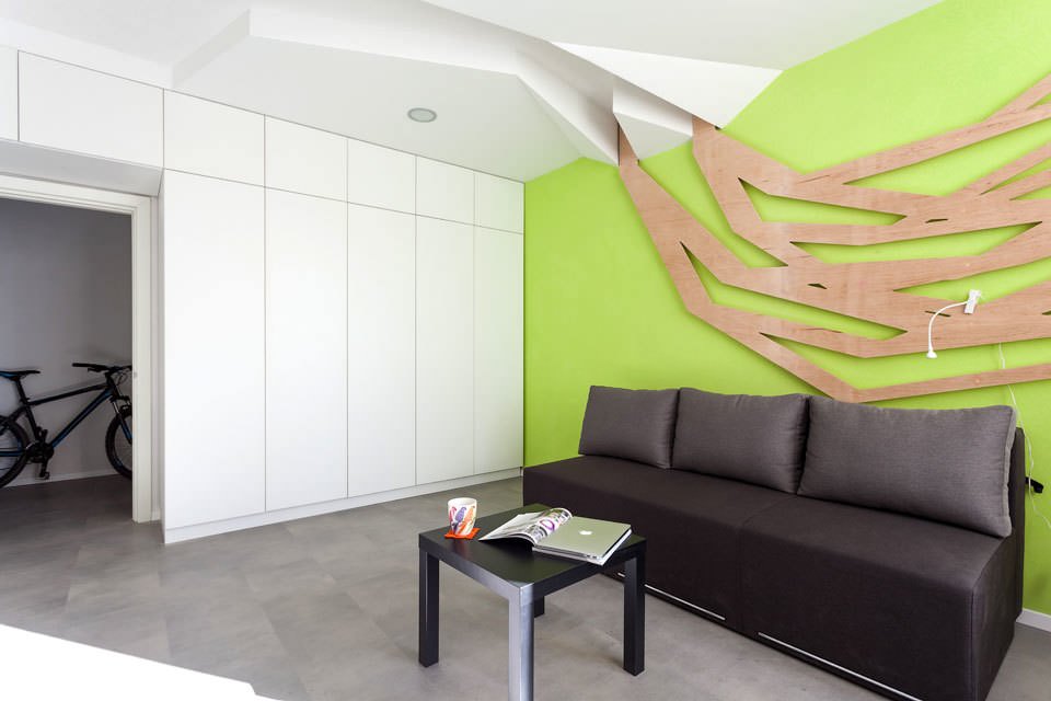 The green color in the living room, complemented by brown tones, does not require the presence of a third color, which is obligatory according to the design canons, since such a combination is almost ideal.