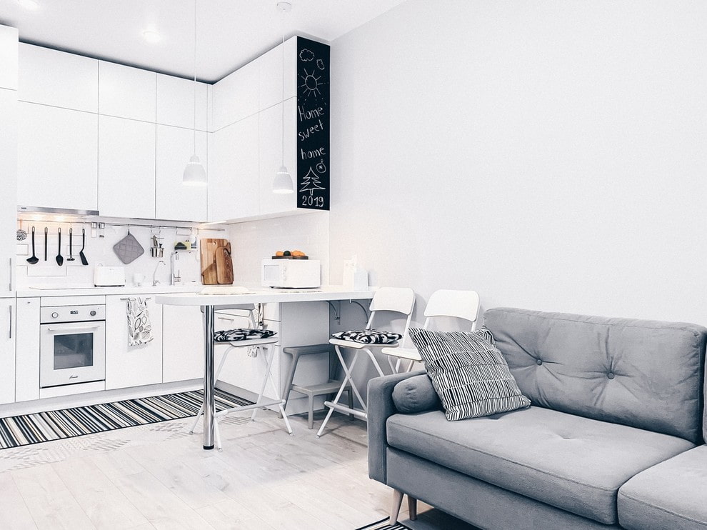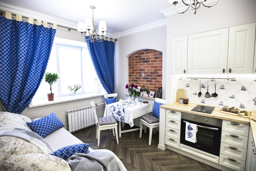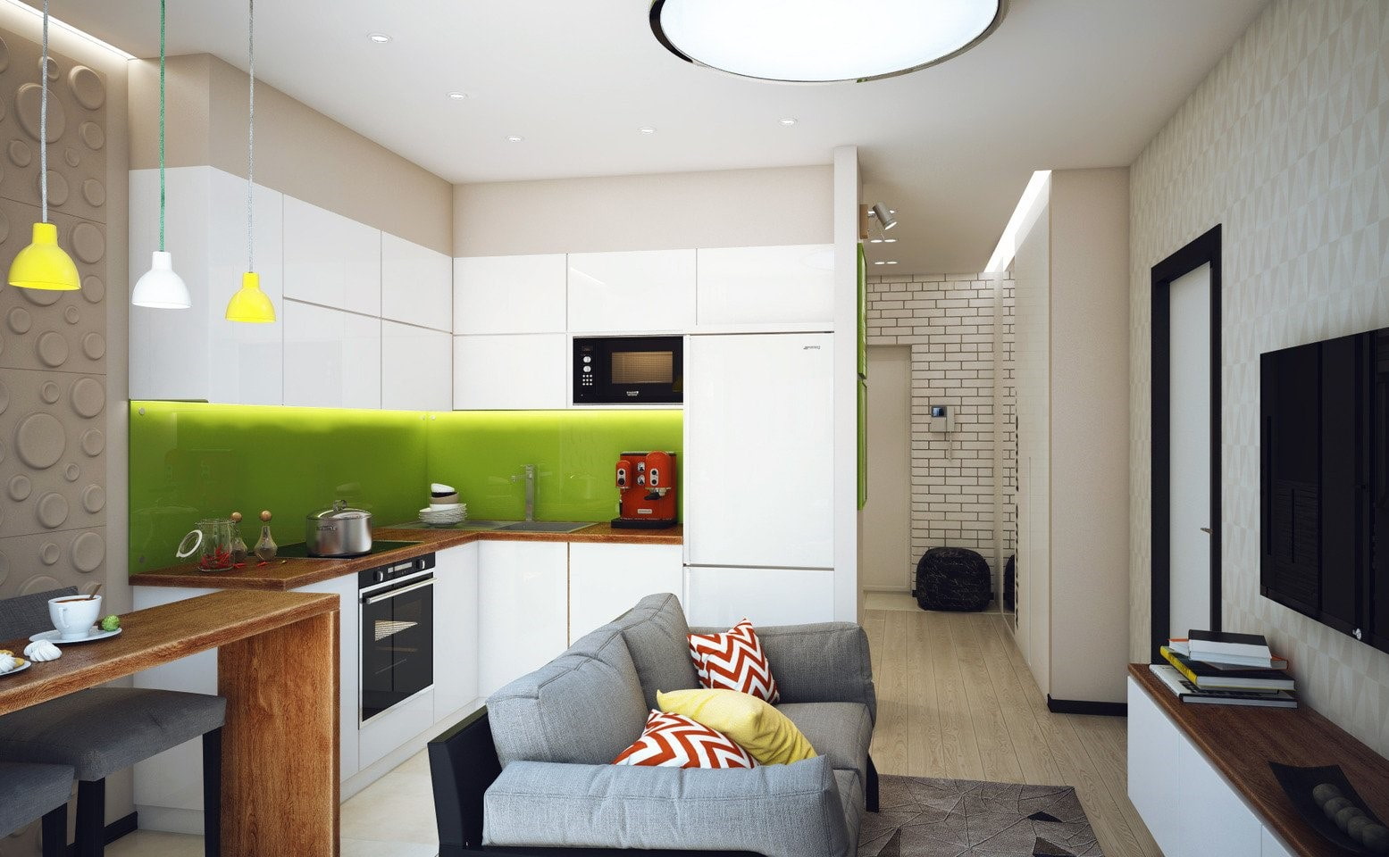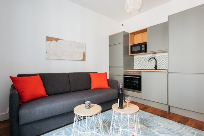 First of all, it is necessary to resolve the issue with the location of the functional areas. If more time will be spent on cooking, then the kitchen segment with a work surface, household appliances and spacious cabinets should occupy the main part of the room. For those who strive for a comfortable pastime and rest, the living area, which includes a comfortable sofa, an audio system, video equipment, and more, deserves special attention. In this case, the kitchen is equipped with a minimum set in the form of a small headset, compact stove and sink.