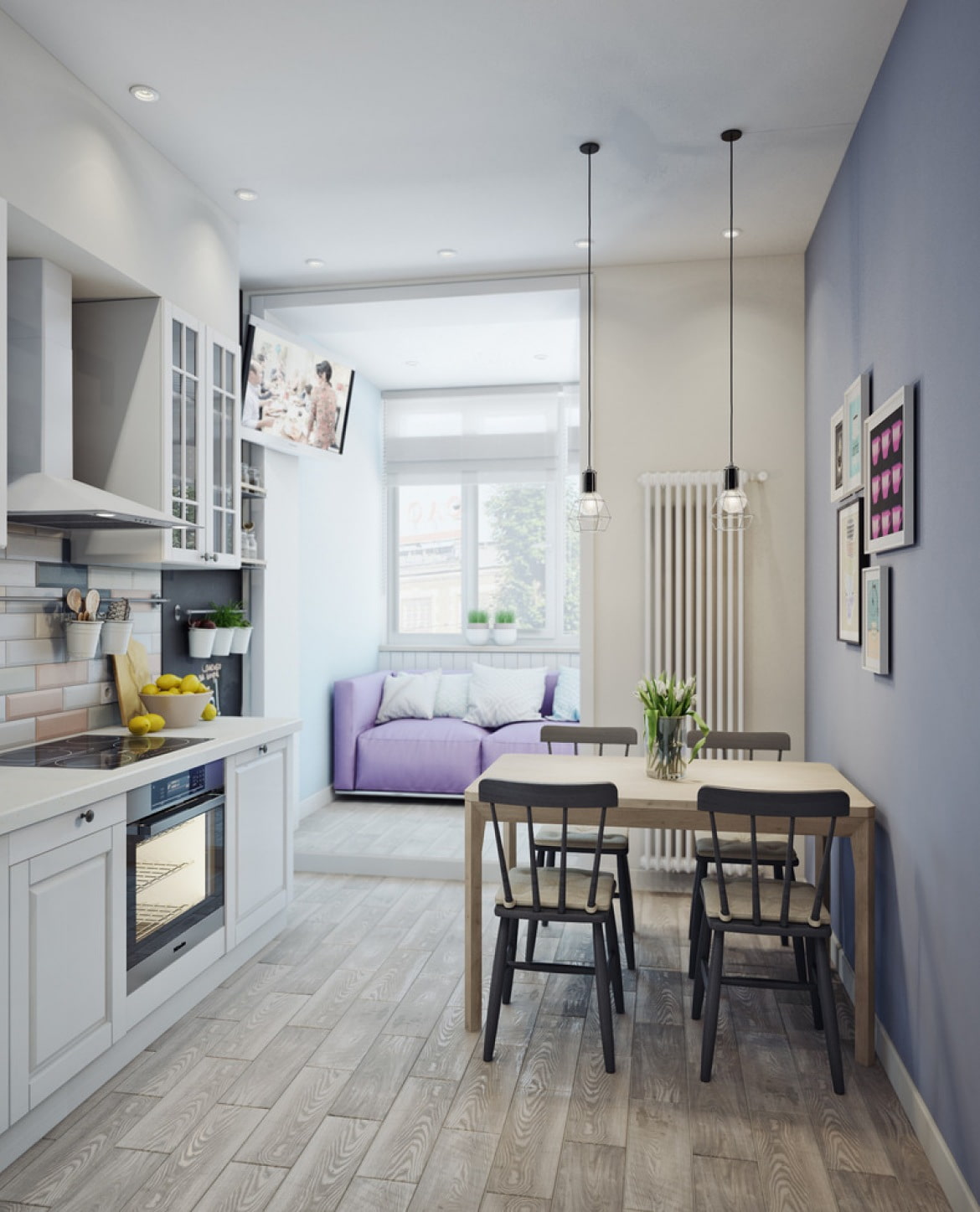 It is advisable to maintain a small space in a light and pastel color palette. The color of the wall covering is especially important. The surfaces are decorated in white, milk, cream colors or other pleasant and fresh colors that fill the kitchen-living room with air and comfort.