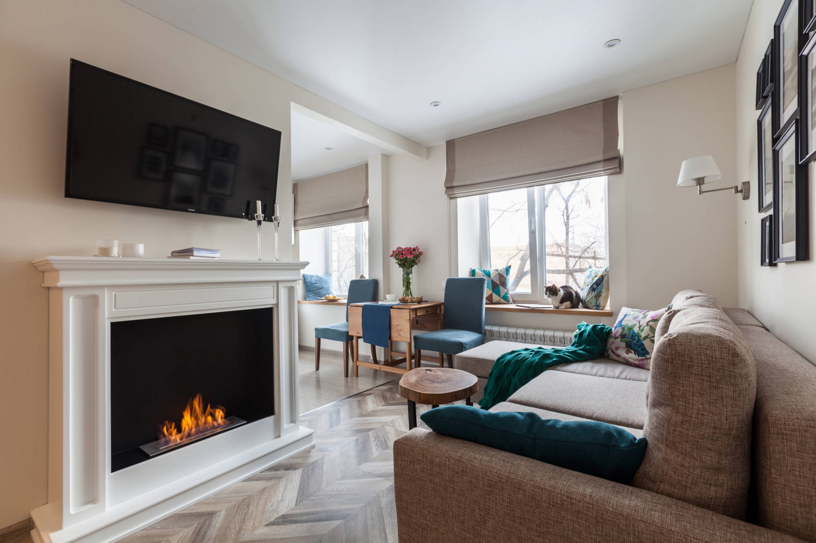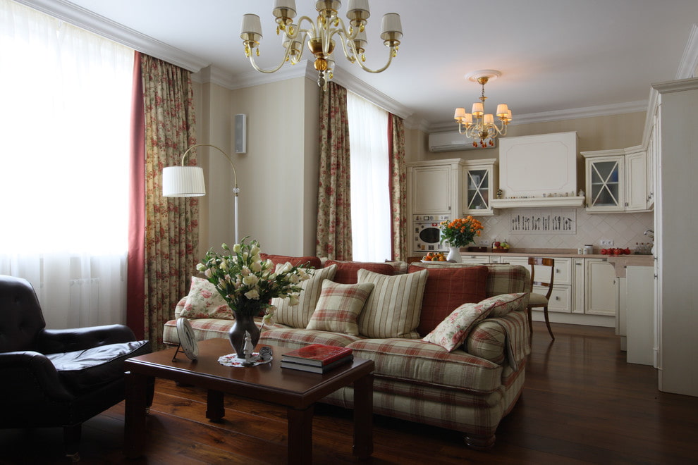 The classic style is characterized by light pastel colors and elegant furniture made of natural wood. The windows are decorated with expensive draped fabrics, and a luxurious crystal chandelier is located on the ceiling. It is appropriate to complement an apartment in a classic style Khrushchev with a false fireplace.