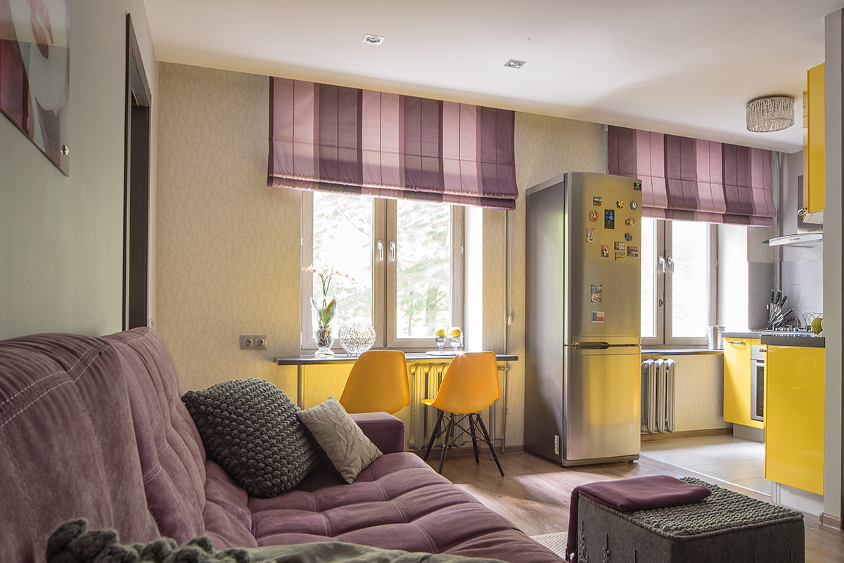 Thanks to the monochromatic light design and the absence of decorative details, minimalism harmoniously blends into the interior of the kitchen-living room in the Khrushchev. There are built-in household appliances, a headset hidden behind the facades, and upholstered furniture of a simple shape. The windows in the room are decorated with blinds, Roman or roller blinds that let light through well.