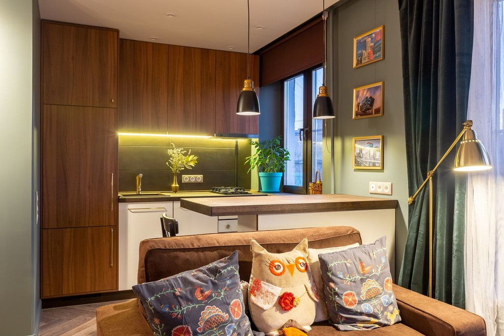 In the photo there is a false wall with a bar countertop in the zoning of the combined kitchen-living room in the Khrushchev apartment.