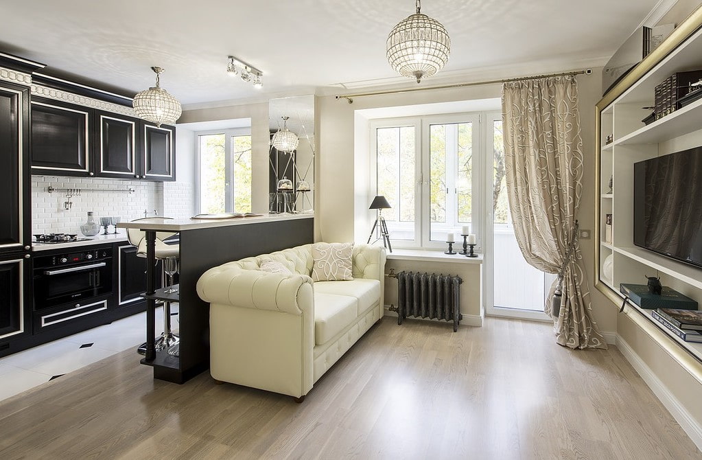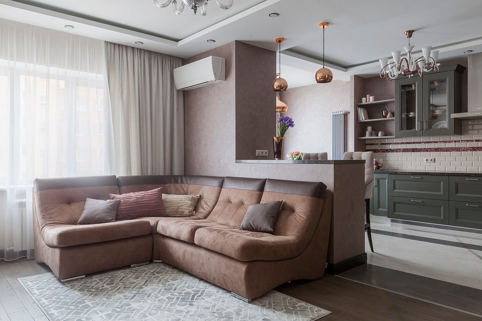 Upholstered furniture located in the living room area should be combined in shape and design with kitchen designs. Thanks to a single furniture ensemble, the transition between functional areas is less noticeable, and the design looks more harmonious and holistic.