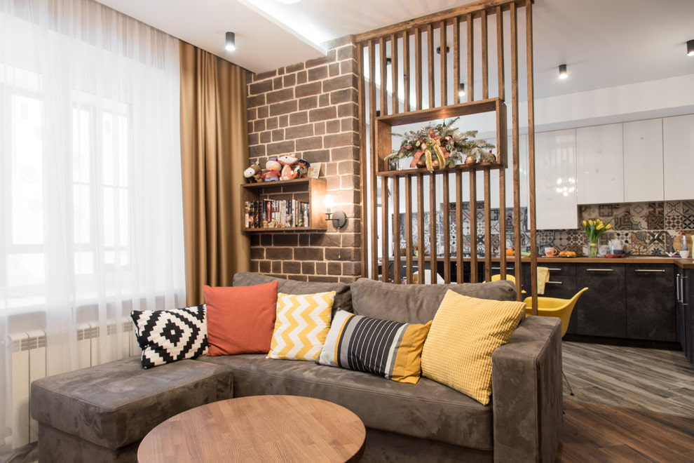 You can divide the kitchen-living room with a light partition or screen made of materials such as bamboo, wood or fabric. These structures differ in different heights, they are mobile or stationary models.