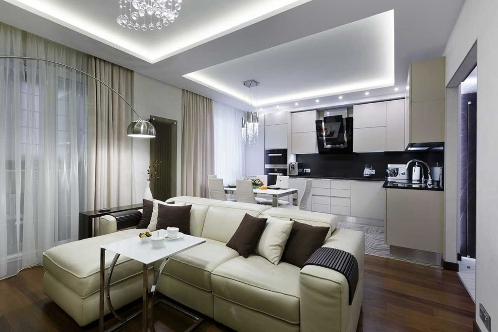 The photo shows the interior of a modern kitchen-living room in a Khrushchev building, with zoned furniture and a stretch ceiling.
