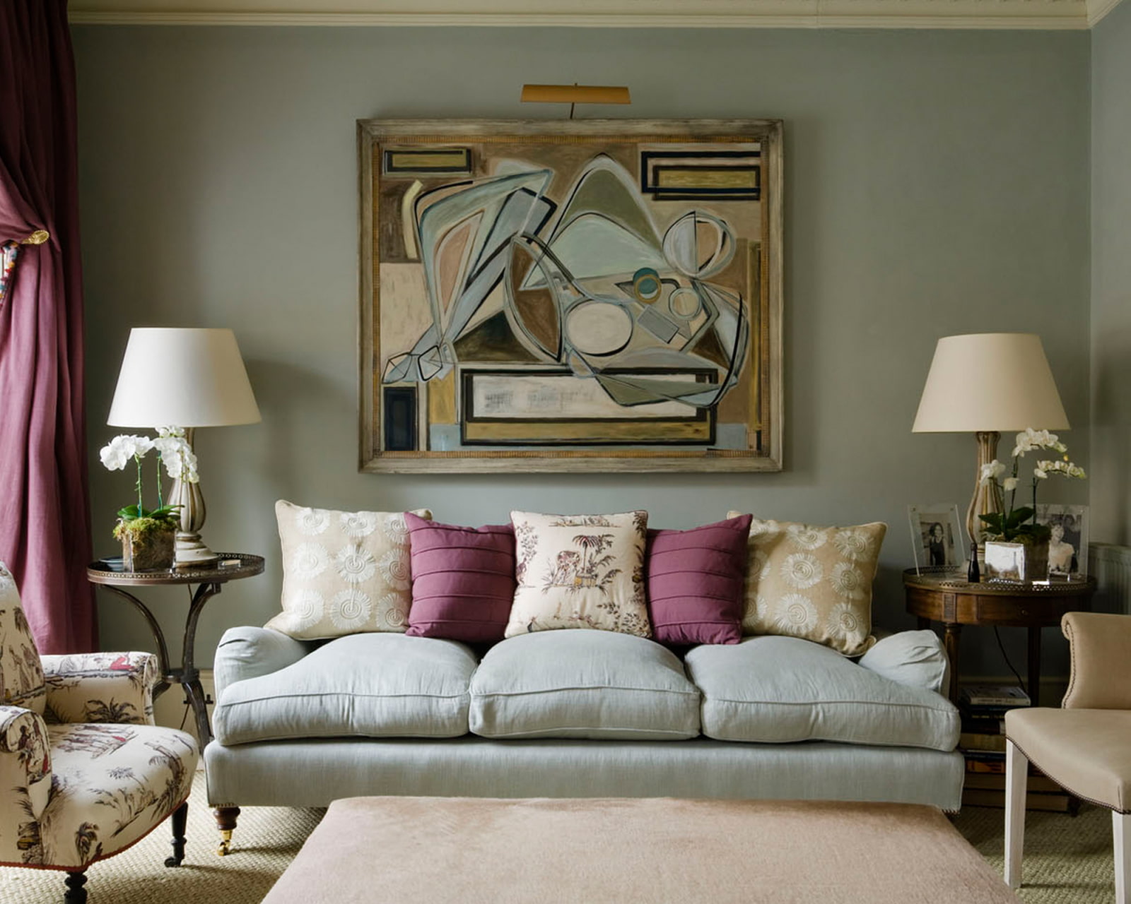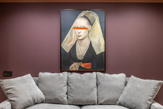 One large painting is the easiest way to decorate a wall above a sofa in a living room. Choose an image that suits the room in style: abstraction or bright pop art for modern, landscape for Provence, classical painting for neoclassical or classical interior.