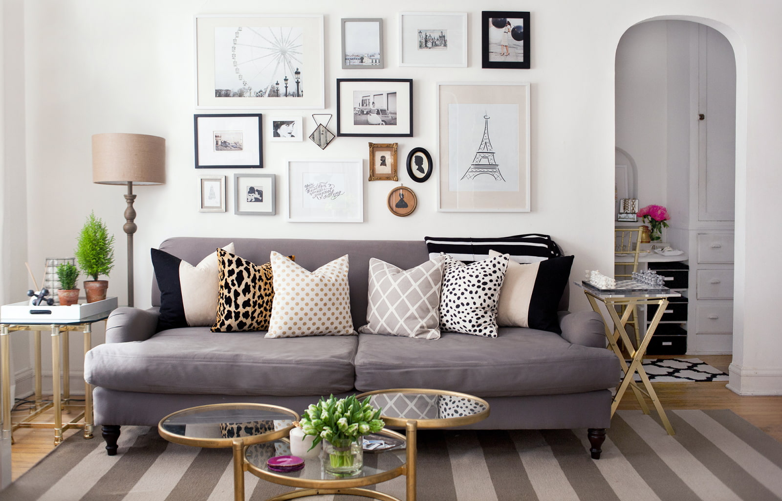 You can collect an even number of photos or posters of the same size and arrange them symmetrically (2-3 rows of 3, for example) or use different shapes and sizes. The group should be correctly combined in style, color scheme or theme. Examples of groups: oil-painted, black-and-white photographs, or seascapes.