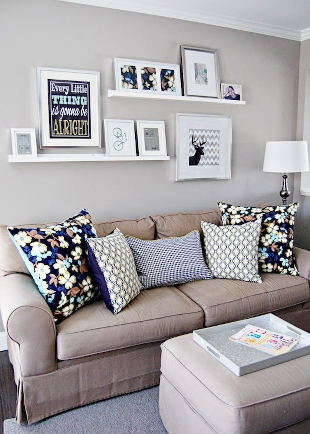 Place open wide shelves above the sofa, decorate them with books, vases, boxes with necessary things and indoor flowers.