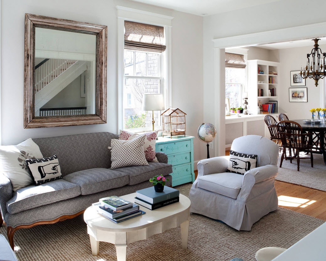 In the photo there is a mirror in a large frame above the sofa
