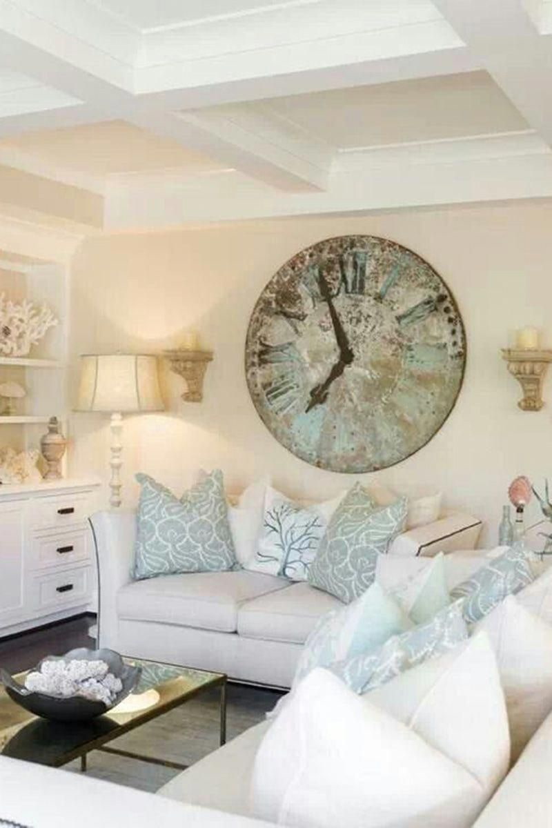 Build the clock into a composition with family photos or lamps, or place them separately. In the second case, their size should correspond to ½ the width of the sofa.