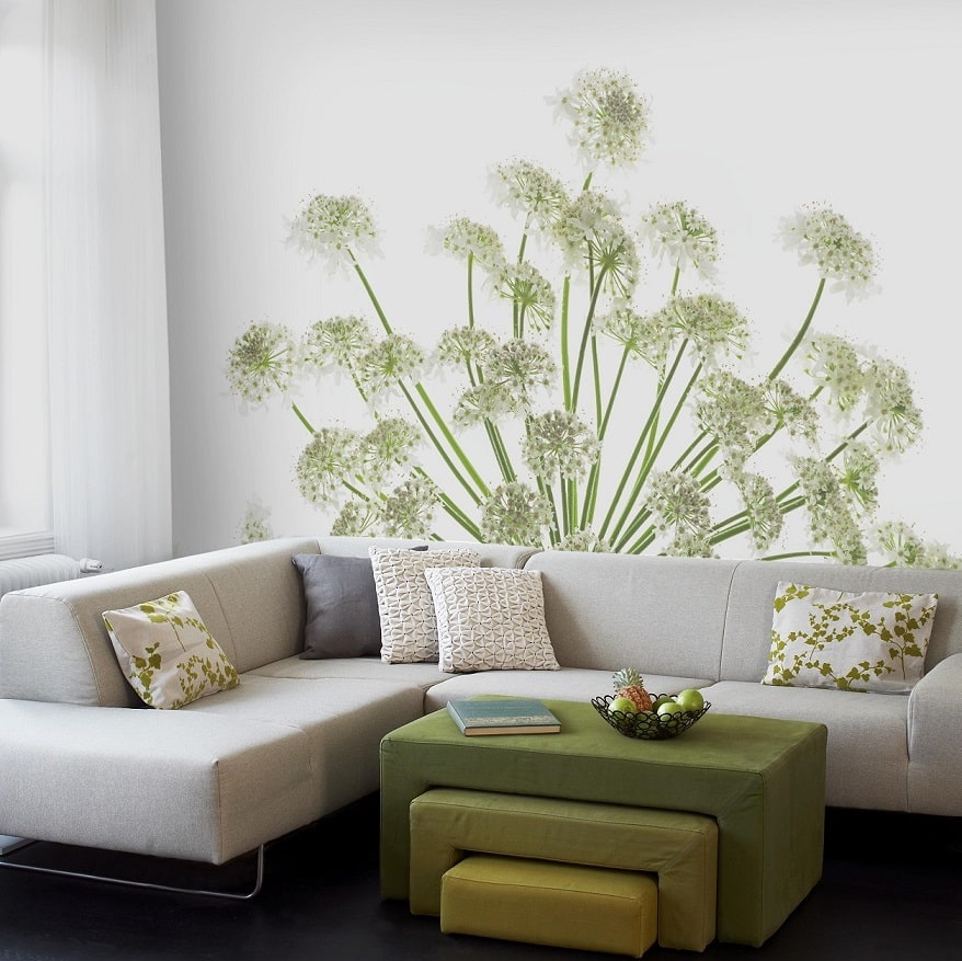The stickers are affordable, come in all tastes and colors, and do the job of decorating a wall above a five-plus sofa.