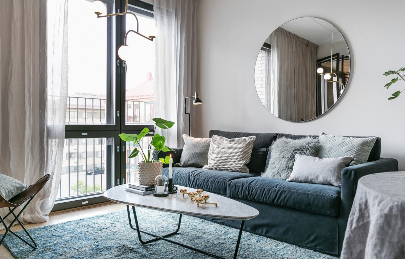You can decorate the wall above the sofa not only after the renovation, but also during it. Decorate the accent wall from the beginning and you don't have to spend money on accessories.