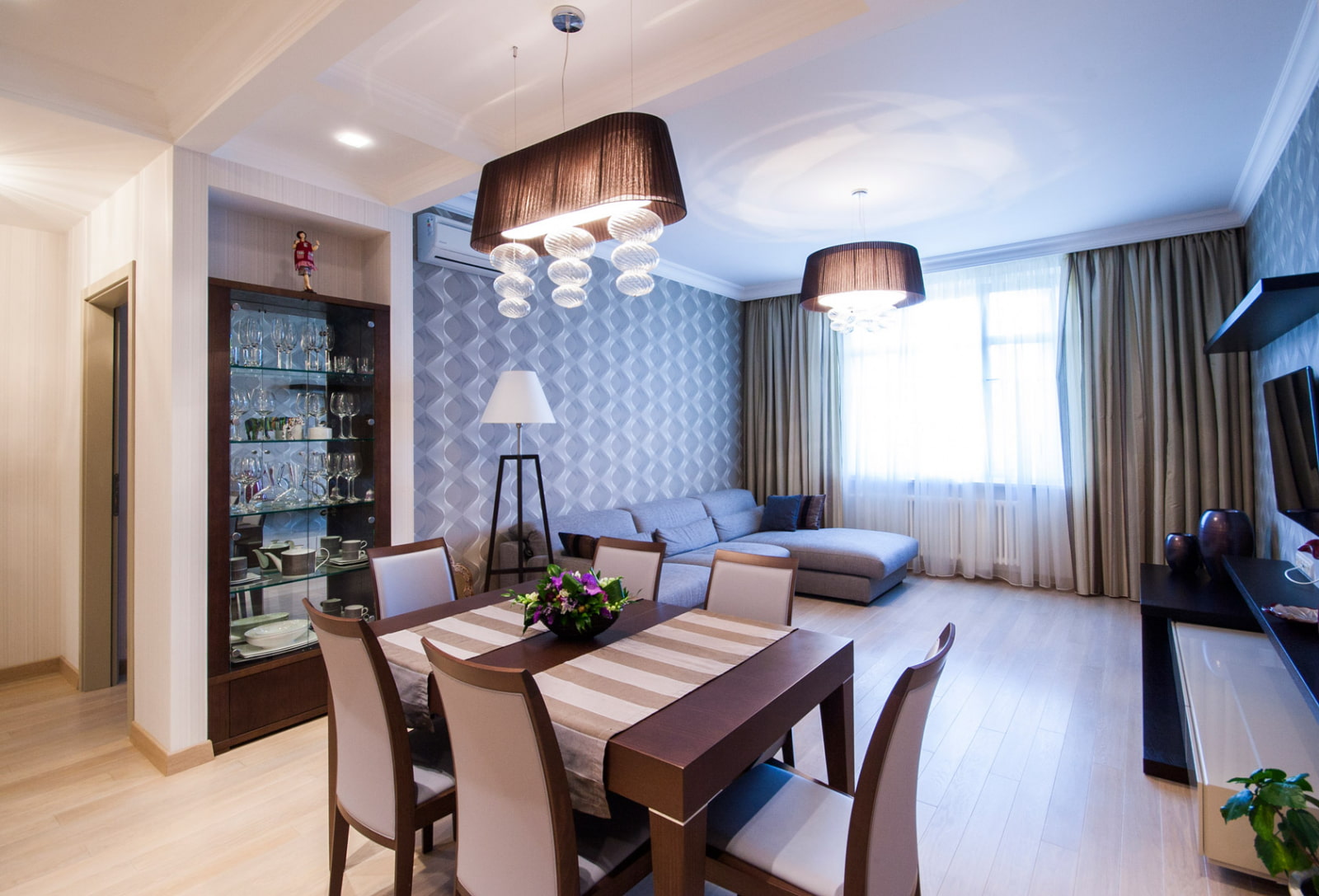 Unfortunately, in most kitchens there is very little space; it is not possible to gather all family members at one table. Therefore, modern homeowners prefer to transfer the dining space to the living room: look at the photo for options for placing a table with chairs.