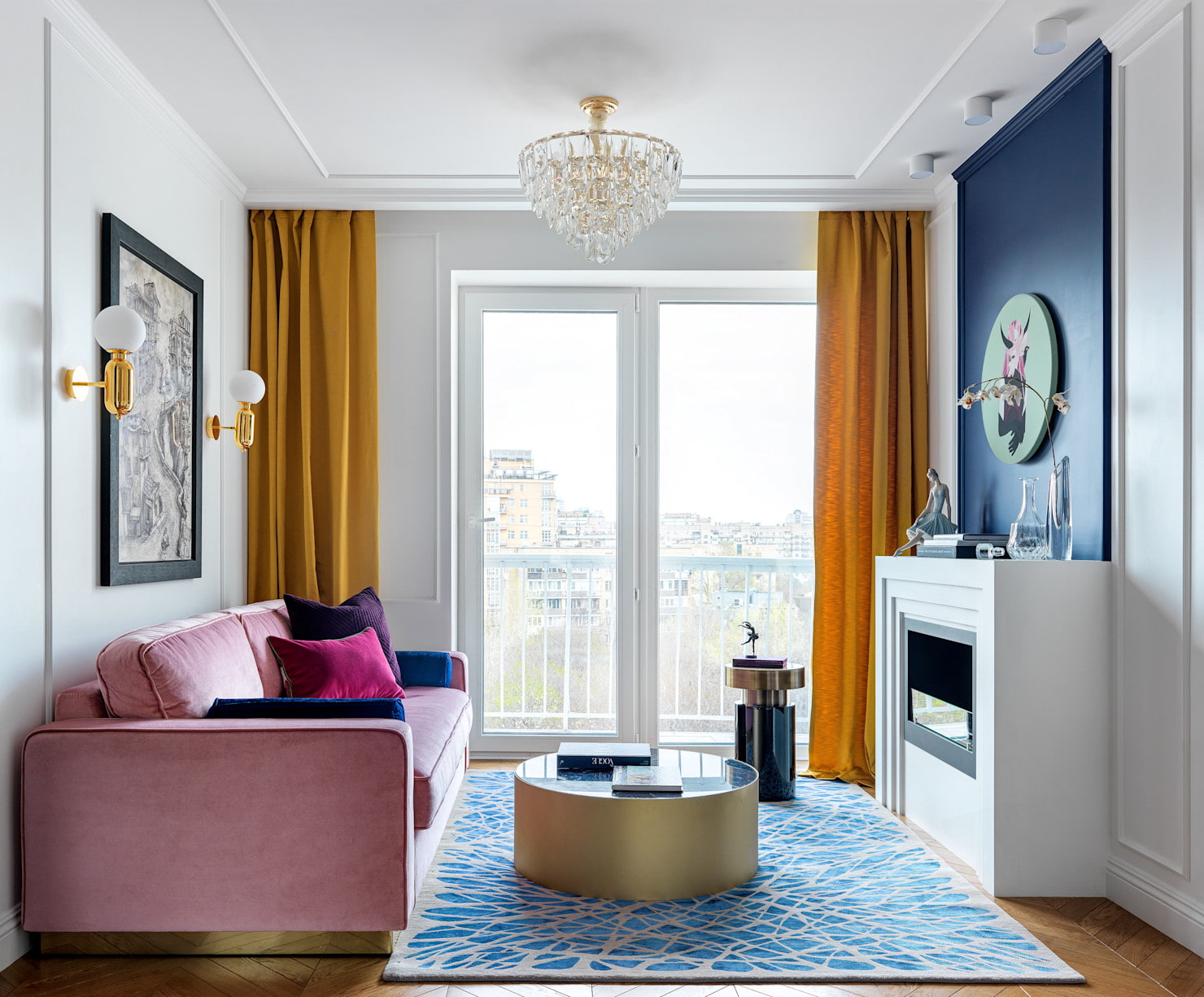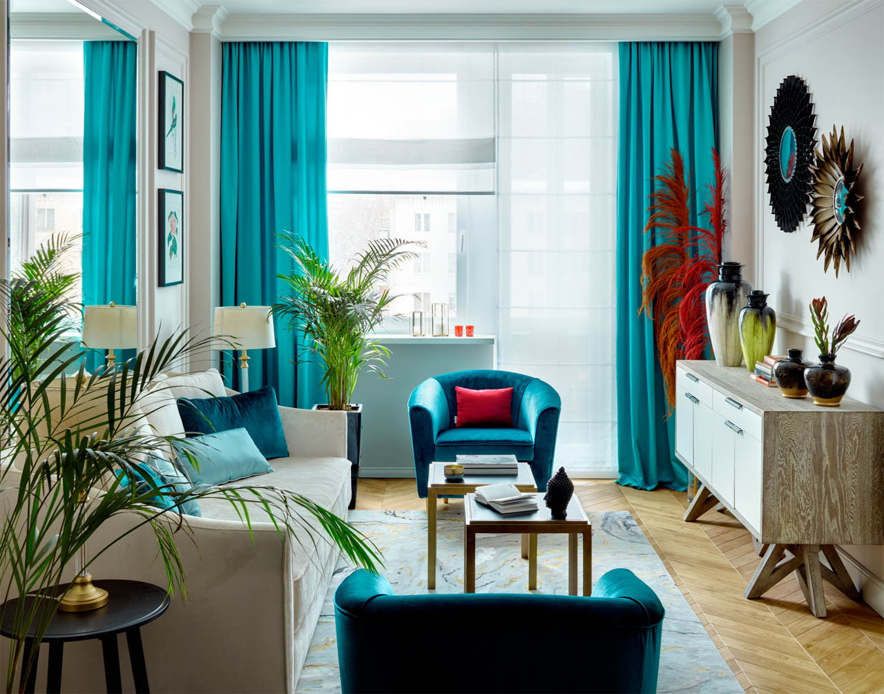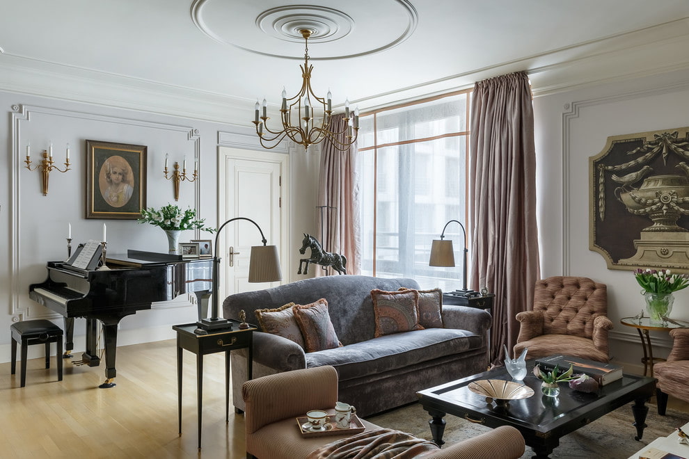 The next step is to arrange all the furniture on either side of the center at the same distance. Use paired furniture (chairs, shelves, lamps) or install unpaired (couch, table) aligning it in the center to the selected focus. As a result, you get a living room interior, both halves of which are a reflection of each other.