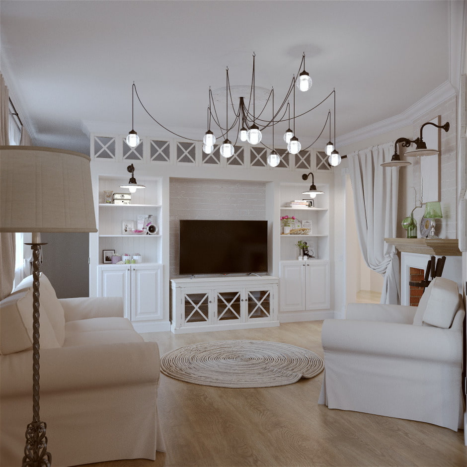 - Opposite the sofa. With a symmetrical arrangement of furniture, 2 identical cabinets are placed on the sides of the fireplace. Or they build a TV into a wide wall.