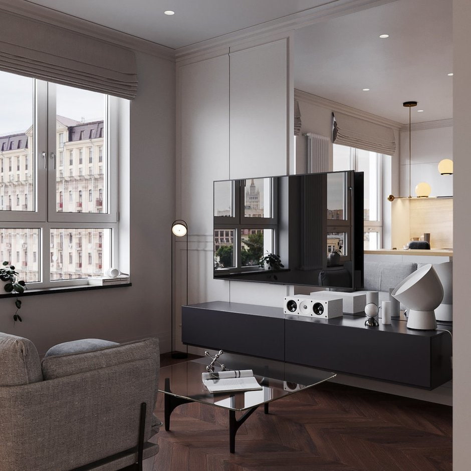 If there are not so many items in the room, focus on their dimensions: allow yourself an impressive sofa, a projector instead of a TV, comfortable large armchairs.