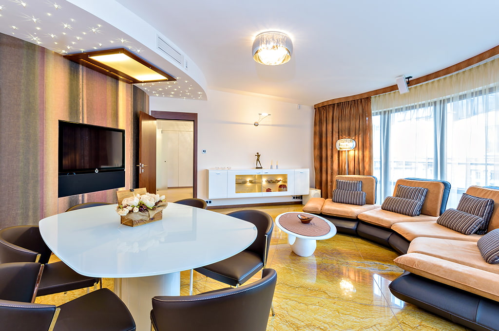 In a spacious living room, you do not need to arrange all the furniture along the walls - it is better to group it by zones and place it as ergonomically as possible. For example, a sofa and armchairs are closer to each other and away from the TV.