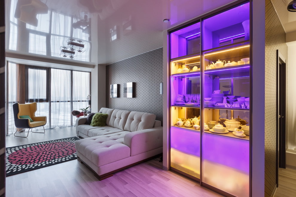 In the photo, a cupboard with decorative multi-colored lighting in the interior of the living room.