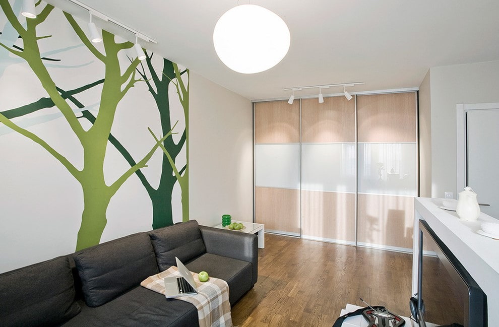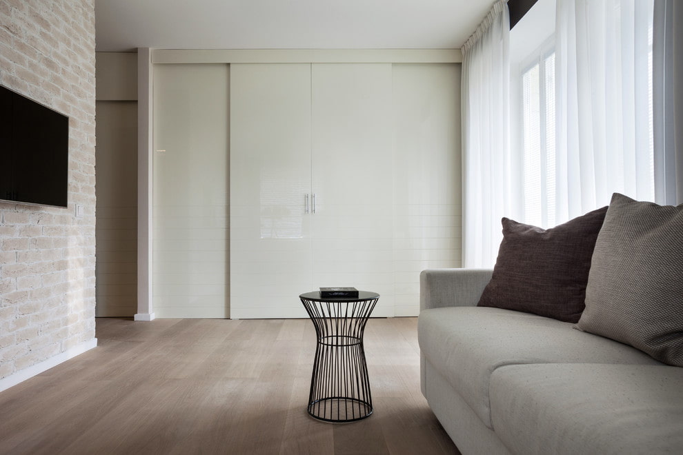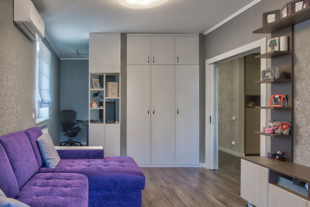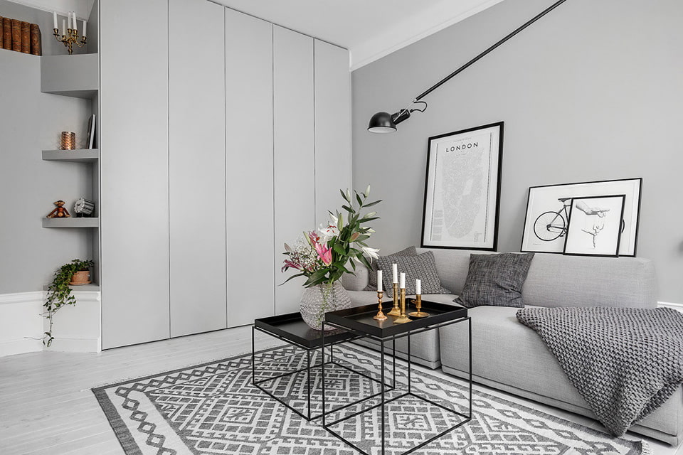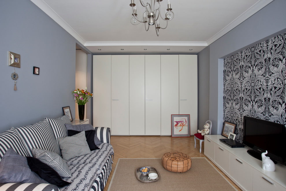 The photo shows a small living room in a Scandinavian style with a matte gray wardrobe.