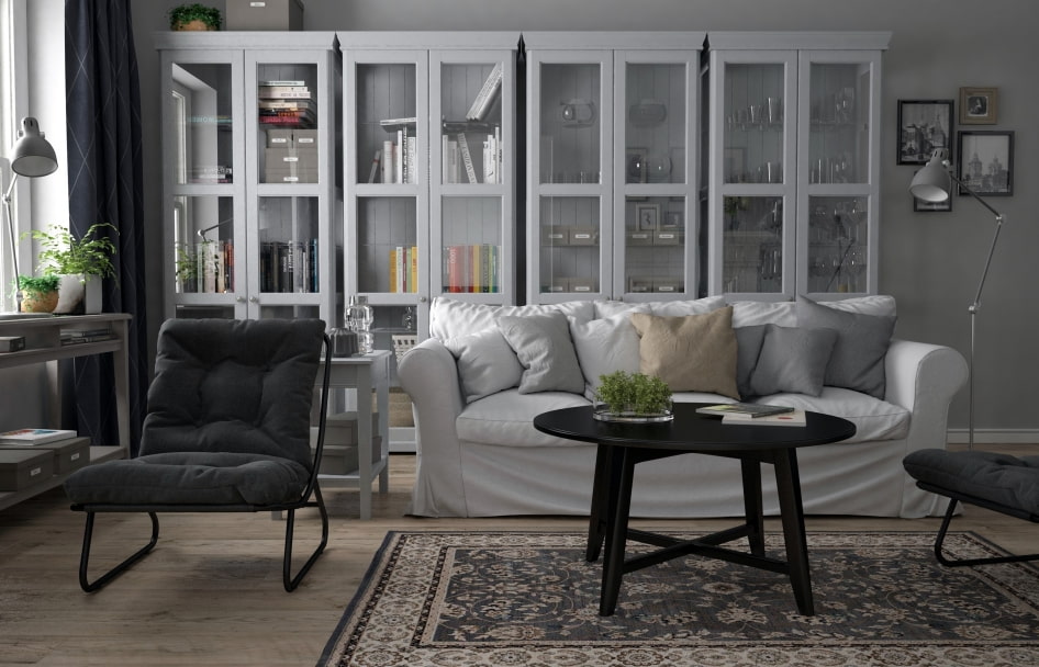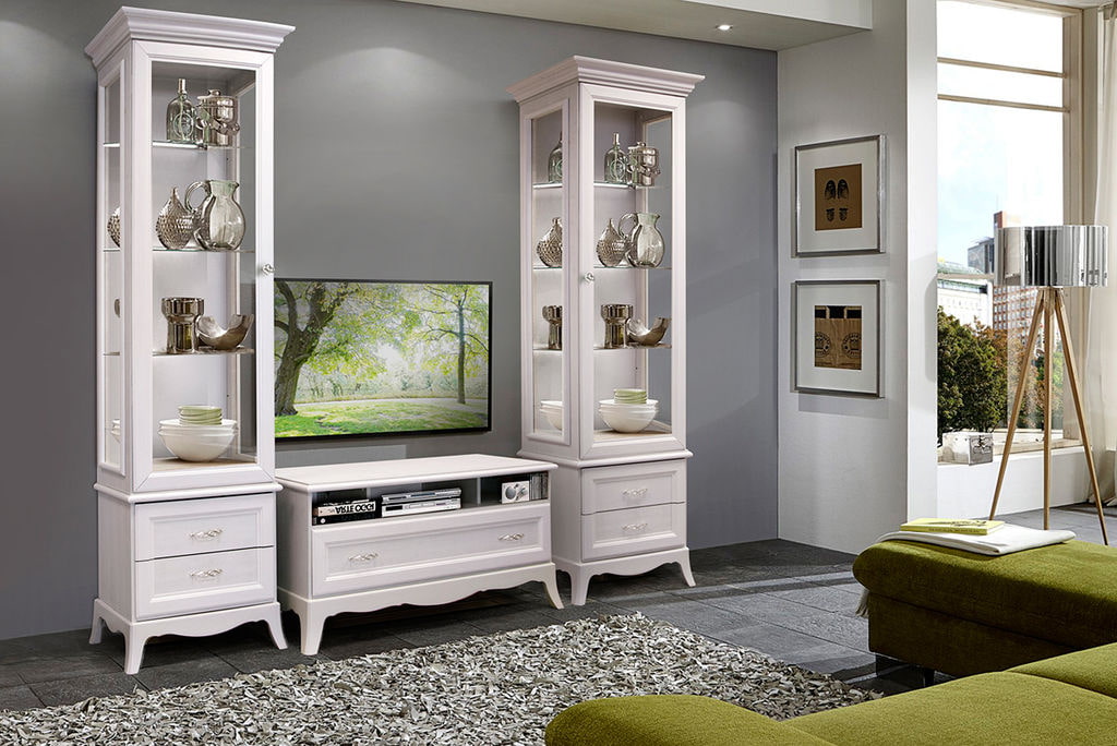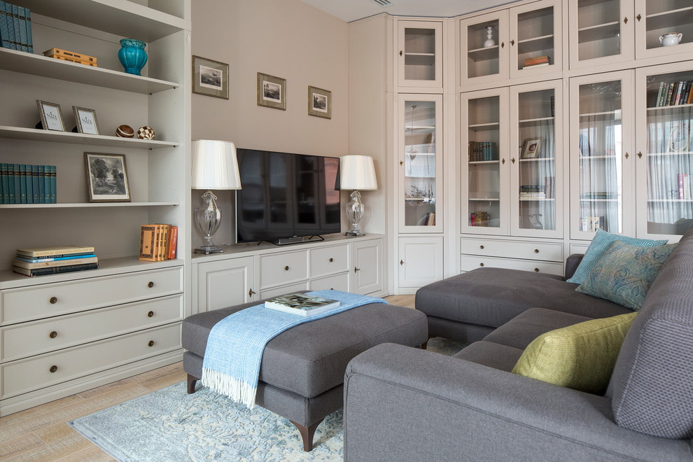Also, to maintain order in the room, high cabinets are used, which perfectly accommodate a huge variety of things necessary in everyday life. In small living rooms, corner models of a semicircular, trapezoidal or triangular shape will be appropriate. They most successfully use free space, give the interior style and eliminate bulkiness.