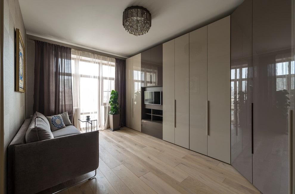 In a small room, there are mainly cabinets in pastel shades, such as sand, gray, beige, milky or white.Models made in light colors do not visually overload or burden the space, giving it lightness and freedom.