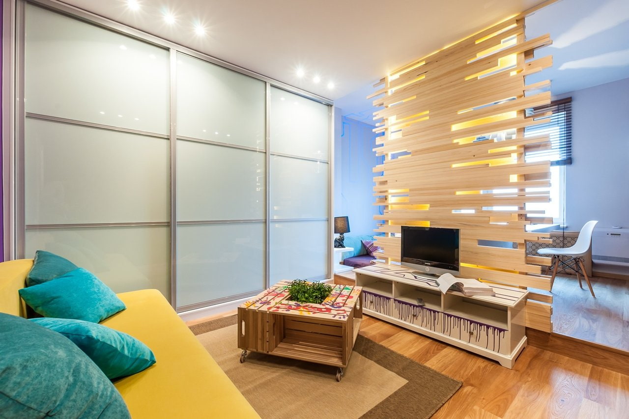 The photo shows the interior of the living room in the loft style, decorated with an open wardrobe in a yellow shade.