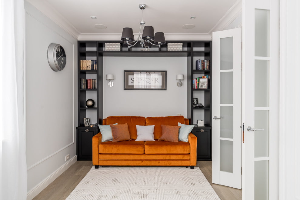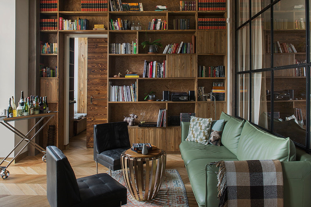 Shelves or bookcases give the room a special atmosphere and form a more serious and slightly austere design.