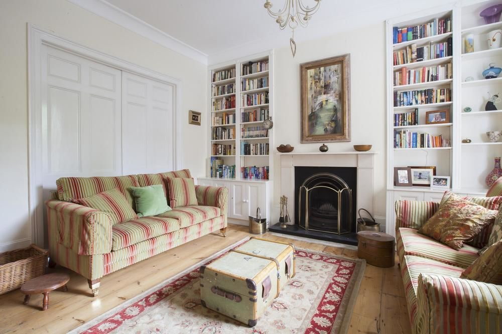 The photo shows the interior of the living room with a bookcase-slide located under the stairs.