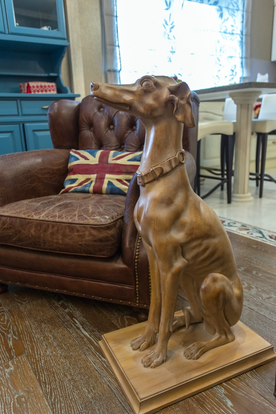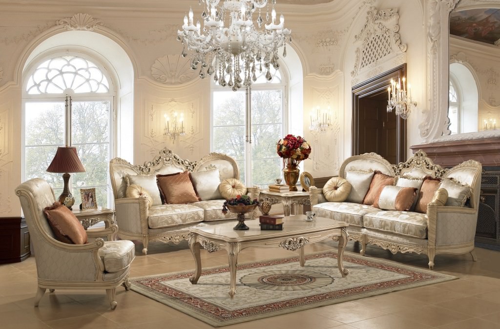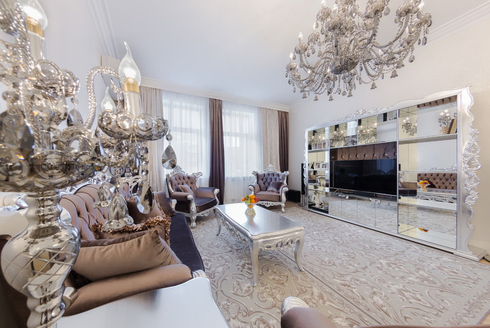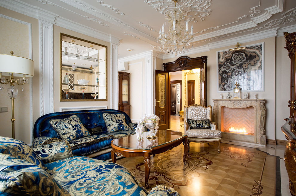 The interior is distinguished by geometric patterns, columns, worn gilding, as well as floor vases, figurines and sculptures. Such a living room should have a marble or parquet floor, classic massive furniture, walls with paintings and gold, a voluminous chandelier.