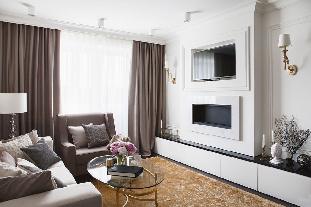 Furniture should convey the texture of the wood and be free from carvings and gilding. The living room in the neoclassical style combines classic and modern equipment and technology, an electronic fireplace.