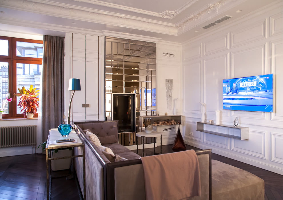 On the picture interior in classic style. A false fireplace with stucco molding, decorative mirrors, moldings, luxurious furniture, light lilac as an accent color - the basis of the style of this small living room.