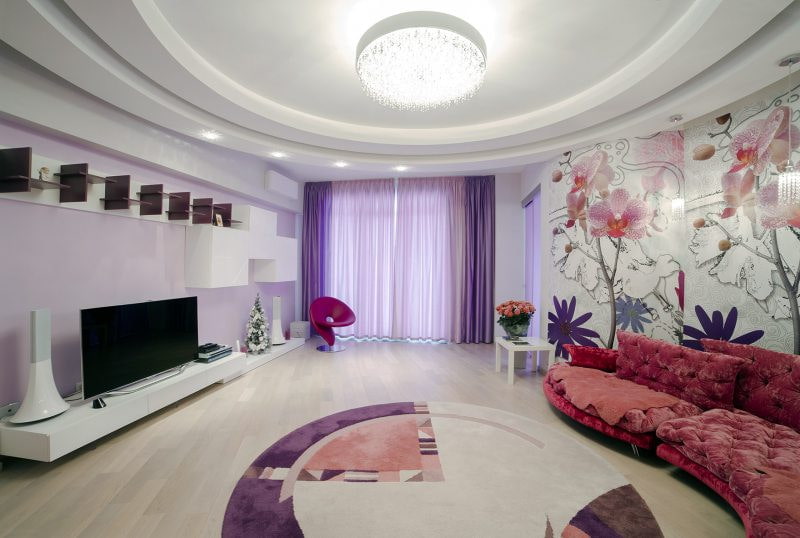 Luxury in a large hall will never go out of style. It is in this style that a curtain made of thin and monochromatic fabric will come in handy for decoration.