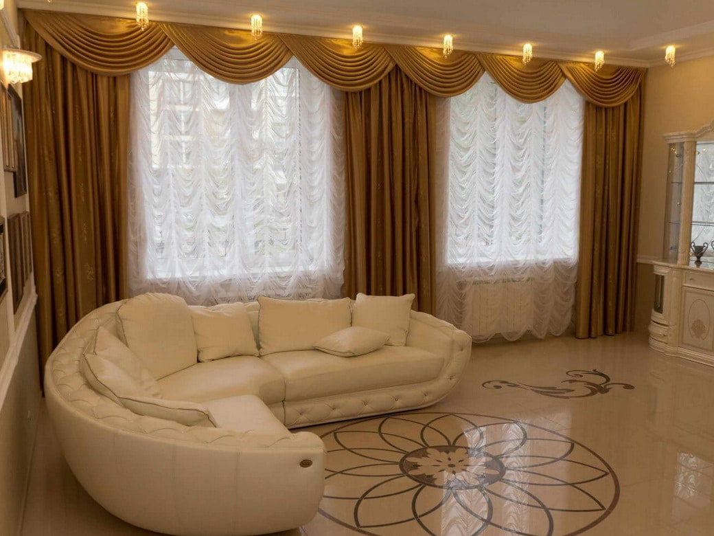 Tulle should complement the lambrequin, creating a single whole with it. It is important that the colors and textures match. One of the most worthy decoration options in the hall.