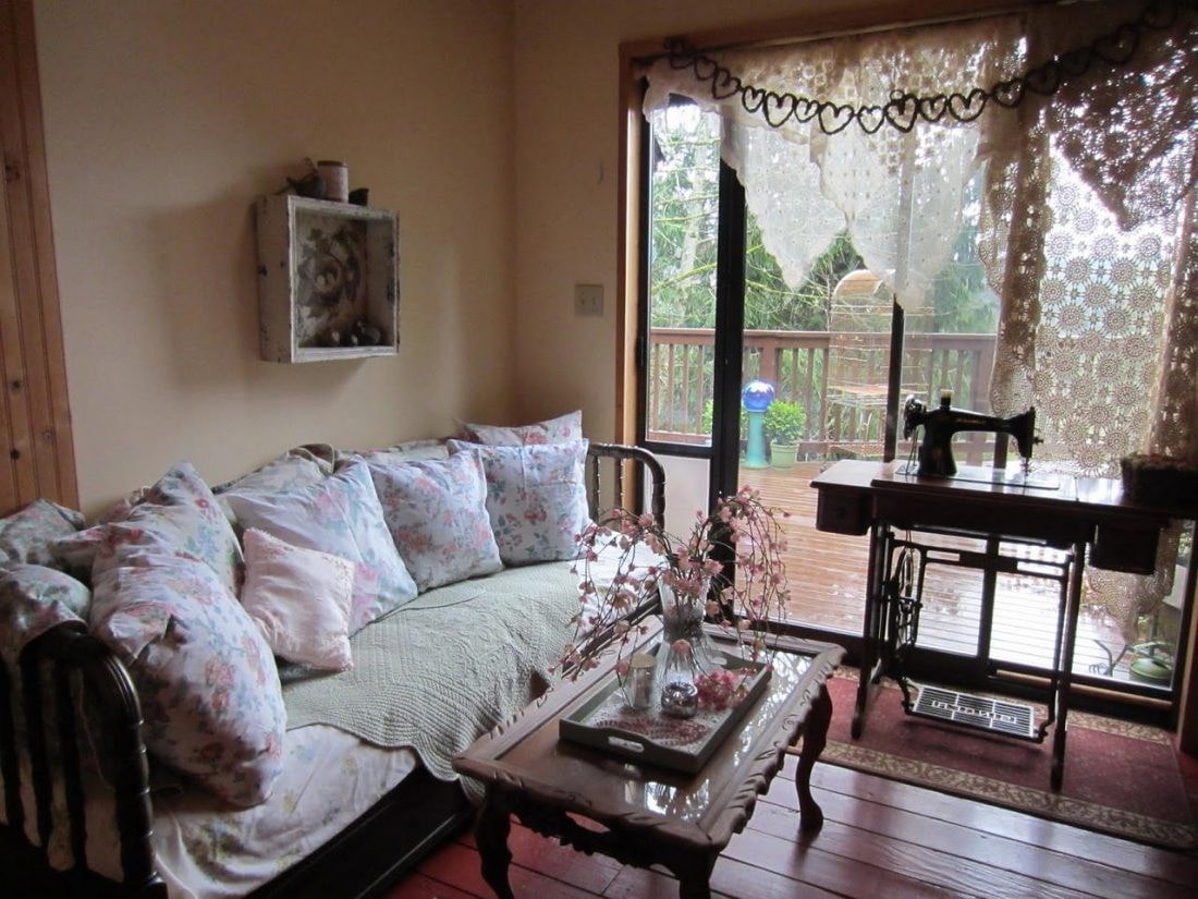 Home and warm provence. Here, special attention should be paid to textiles.To decorate windows, a transparent white tulle with an ornament or with a floral print is suitable.