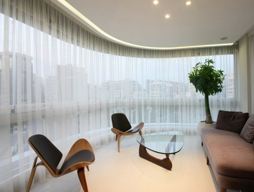 The photo shows a modern-style hall with light curtains.