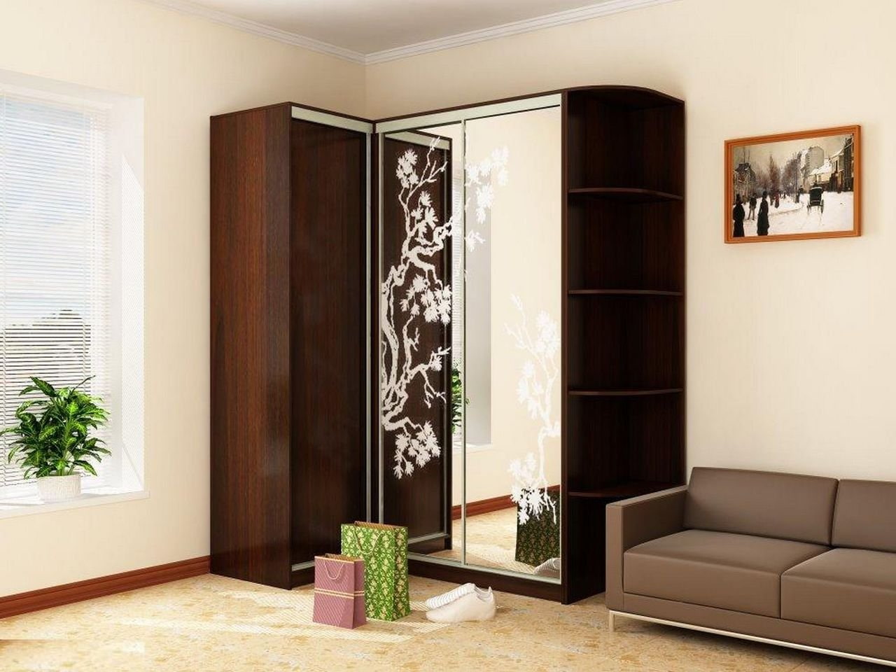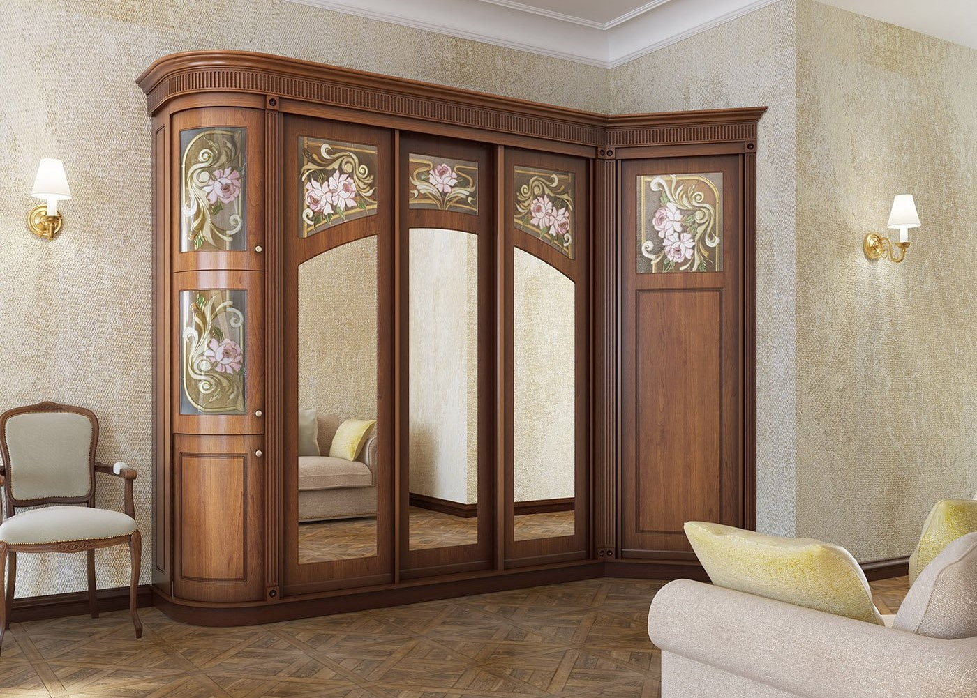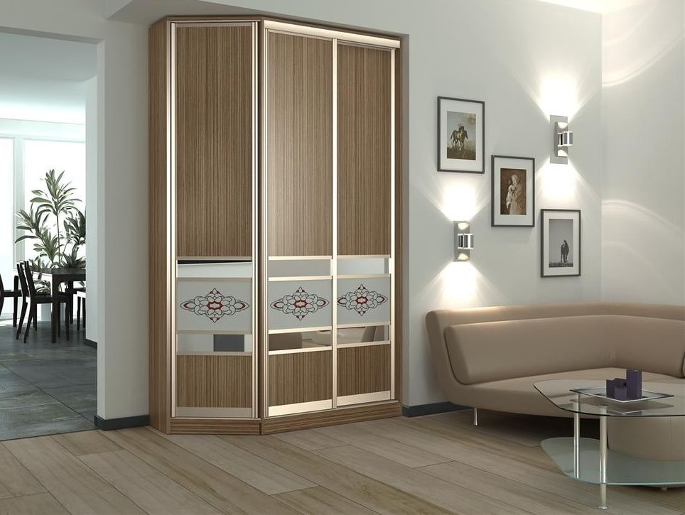 The photo shows the interior of the living room with a corner wardrobe, decorated with mirror inserts and a pattern.