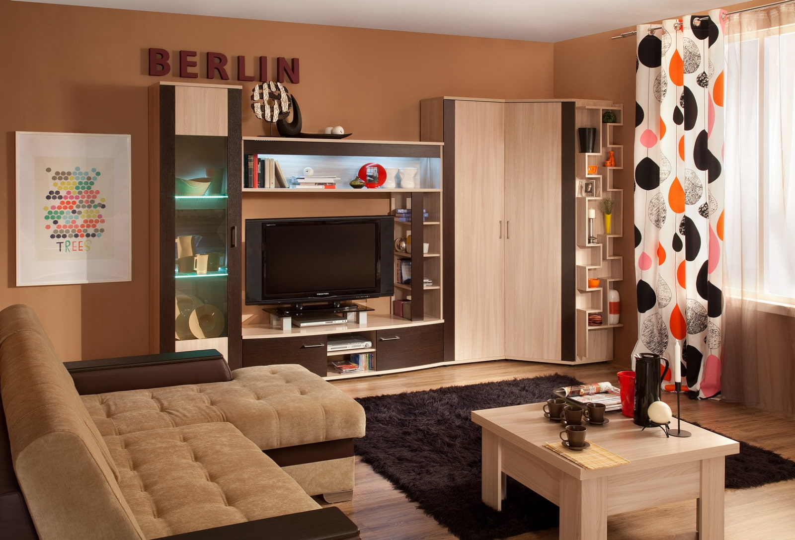 In the photo there is a corner wardrobe in wenge shade with open side shelves in the interior of the living room.