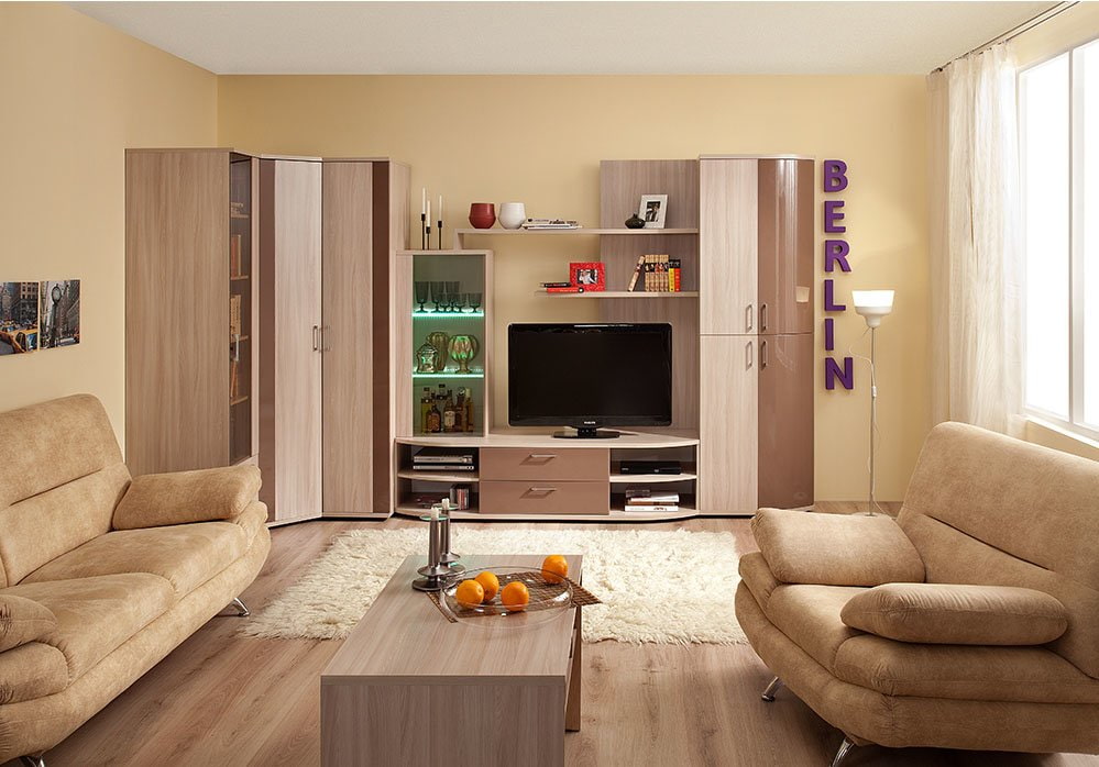A model with a niche or TV shelf, which can occupy either one side of the wall or be located in the center, becomes the best option for any living room and also involves storing your favorite collections, figurines, vases and other decor.