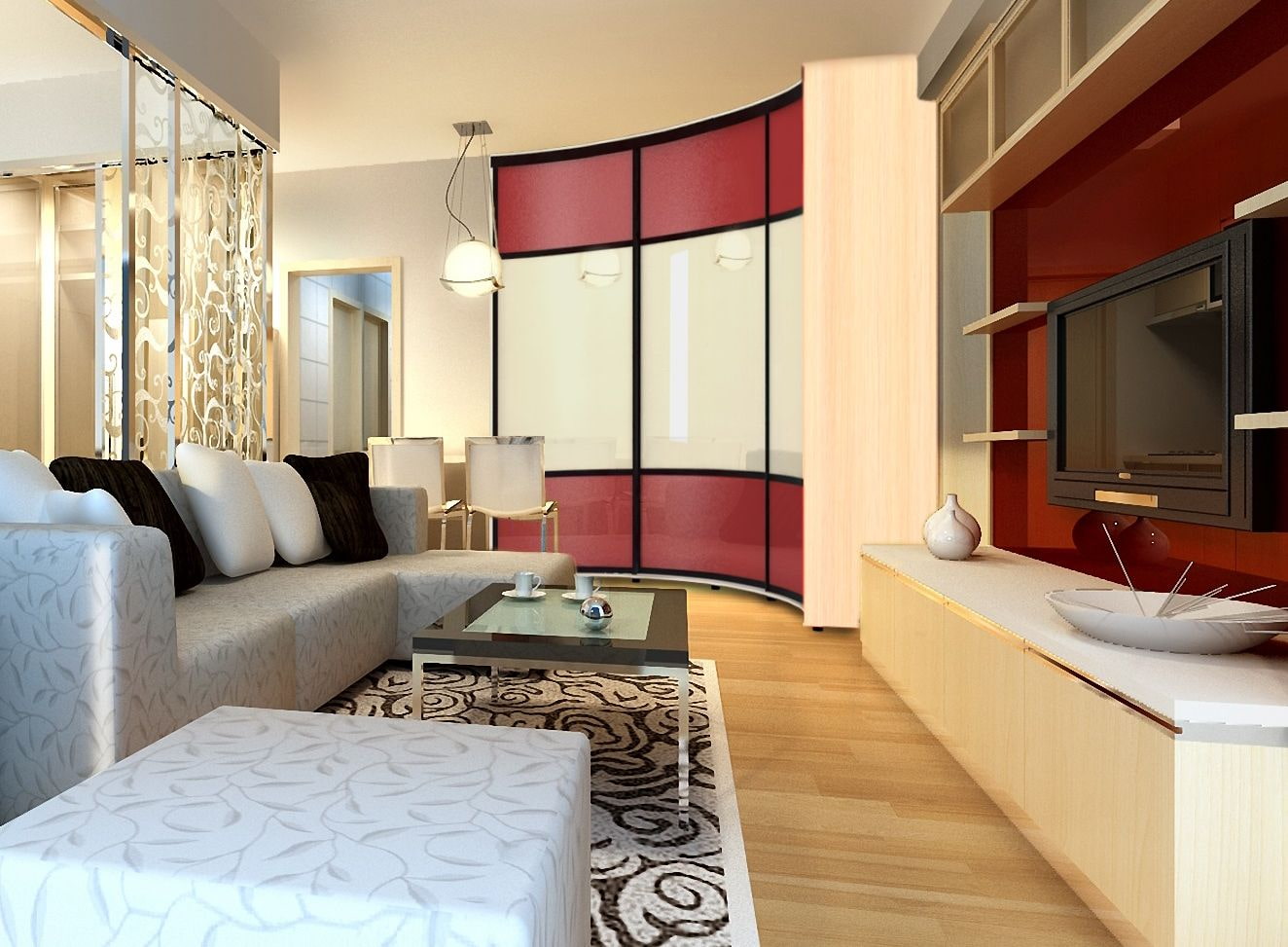 In the photo there is an L-shaped corner wardrobe with lacobel glass in the interior of the living room.