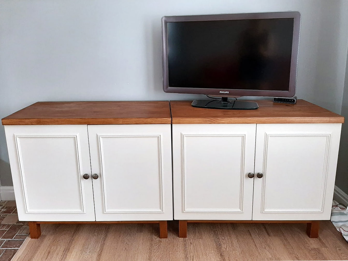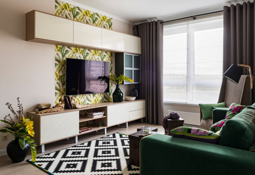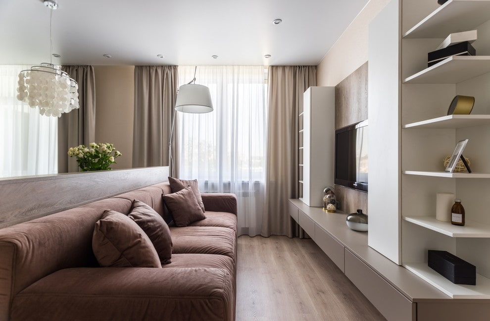 Usually it consists of several sections that can be moved and connected at your discretion: TV stands, a small cabinet and shelves. To make furniture look lighter, choose light colors, hanging bedside tables or glossy fronts.