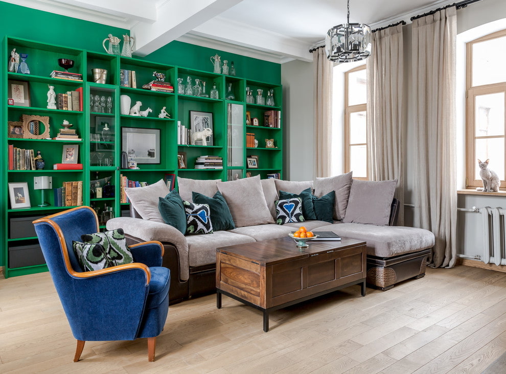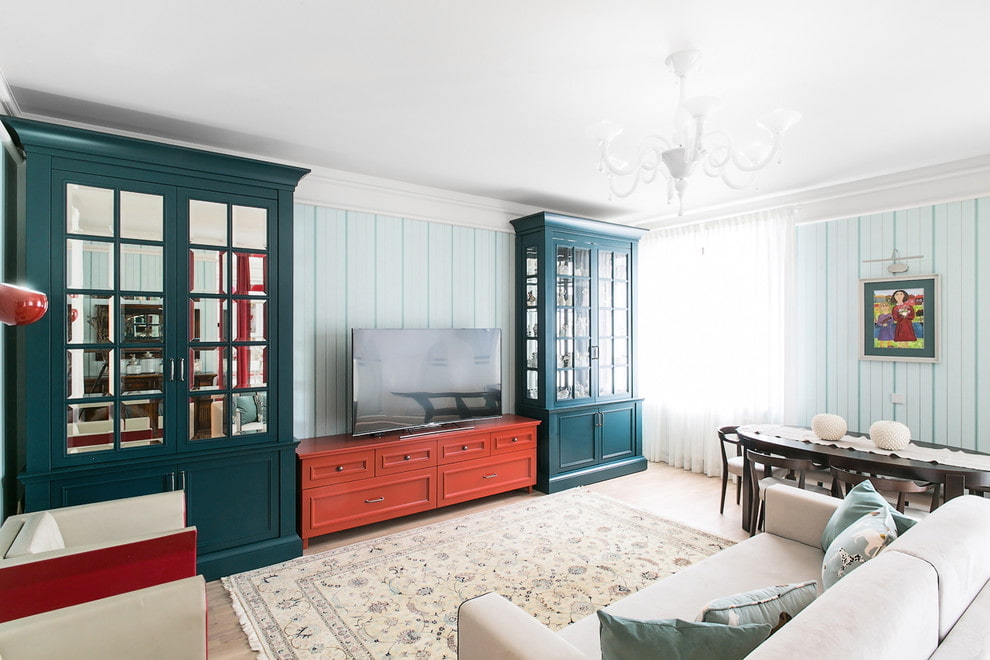 If the wall is used to showcase a home library or a valuable collection, give preference to light cabinets with transparent doors. Glass not only protects objects from dust, but also gives the interior airiness, reflecting the light falling on them.