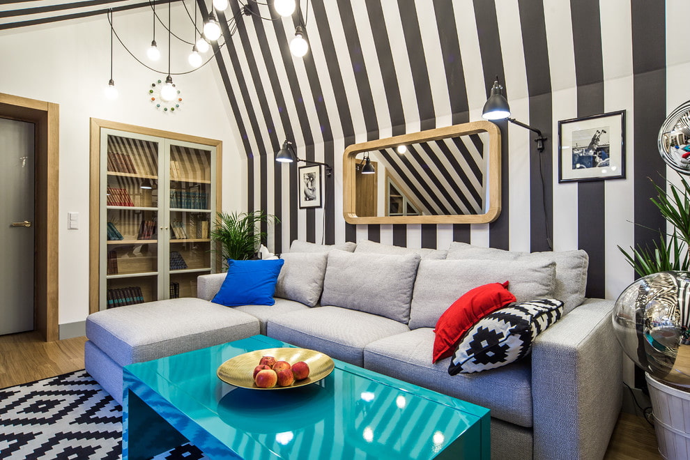 A fairly common and traditional type of accommodation, which is very practical and functional. The product above the sofa makes the interior composition more harmonious and does not spoil the overall design of the room.